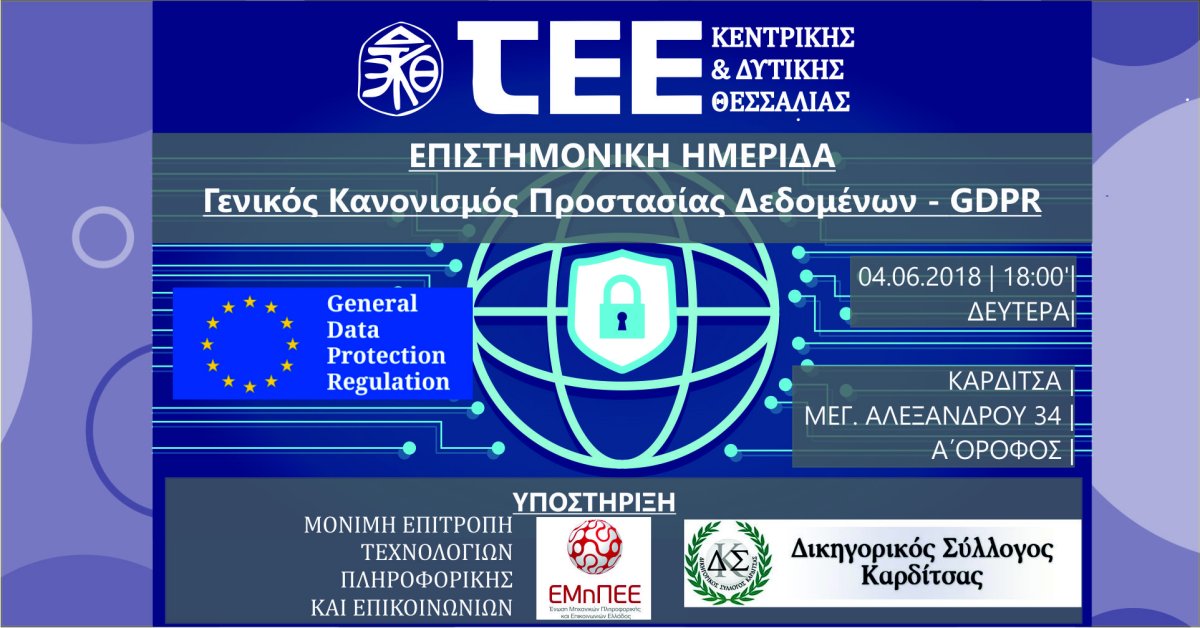 To TEE Κεντρικής και Δυτικής Θεσσαλίας, διοργανώνει Ενημερωτική Ημερίδα με θέμα «Γενικός Κανονισμός Προστασίας Δεδομένων – GDPR», στην Καρδίτσα, τη Δευτέρα 04.06.2018 και ώρα 18:00, Μεγάλου Αλεξάνδρου 34, Α΄ όροφος (Αίθουσα εκδηλώσεων ΠΕΔ Θεσσαλίας).